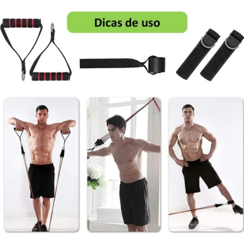 Com este Kit você faz praticamente todos exercícios que se faz numa academia, ótimo para iniciantes ou para suplementar os trabalhos já feitos em academia de pessoas com mais experiência, aqui seguem alguns benefícios de se exercitar com nossos elásticos.